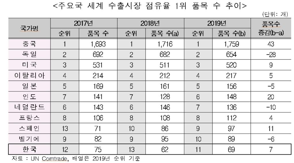 | 세계 점유율 1위 수출 제품 한국 69개 ‘11위’…역대 최고 (0) | 2021.03.08 |