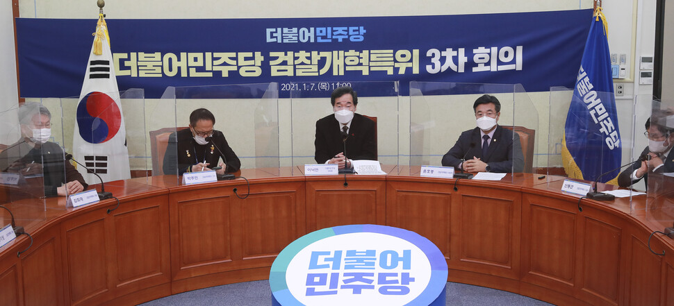 이낙연 더불어민주당 대표(가운데)가 2021년 1월7일 오전 서울 영등포구 국회에서 열린 검찰개혁특별위원회 3차 회의에서 머리발언을 하고 있다.