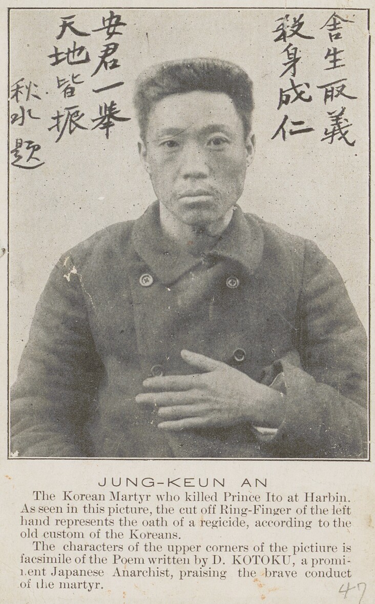 일본의 무정부주의 사상가 고토쿠 슈스이가 갖고 있던 안중근 의사의 사진엽서 견본. <오사카마이니치신문>의 사진을 쓴 기존 엽서의 설명을 영역한 설명으로 바꾸고 사진에 안 의사를 찬양하는 자신의 한시를 써넣었다. ‘목숨 버려 의로움을 취하고 자신을 죽여 인(仁)을 이루었네…’라는 내용을 담고 있다.