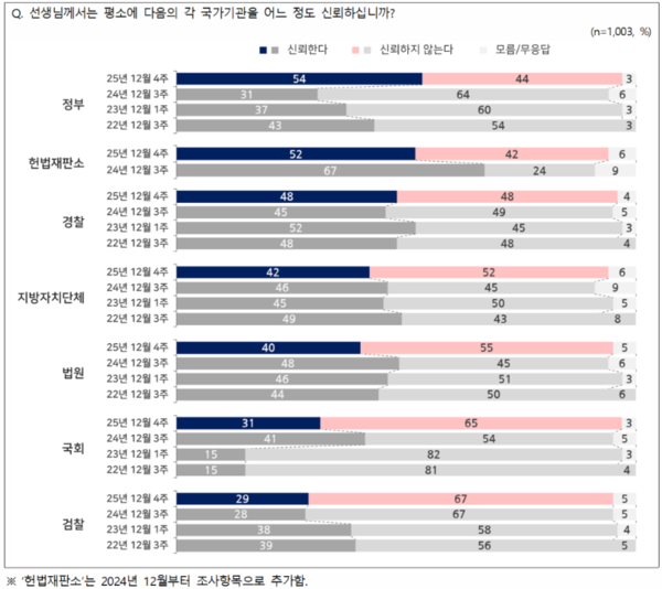 | [여론조사] 정부 신뢰도 1년 전보다 23%p 급상승한 54% (0) | 2025.12.26 |
