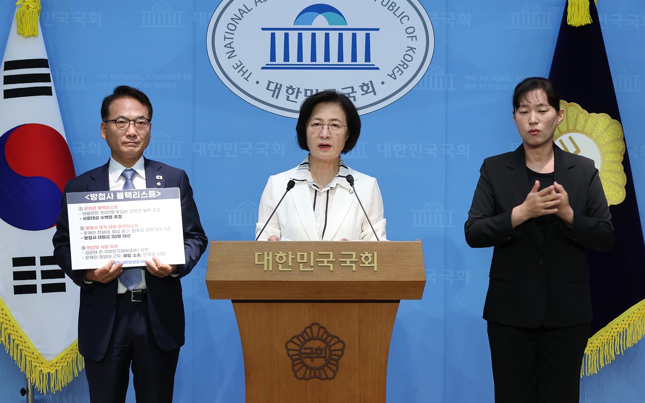 ▲더불어민주당 추미애 의원(가운데)와 박선원 의원(사진 왼쪽)이 지난 6월 23일 서울 여의도 국회 소통관에서 방첩사 블랙리스트 관련 기자회견을 하고 있다 ⓒ 연합