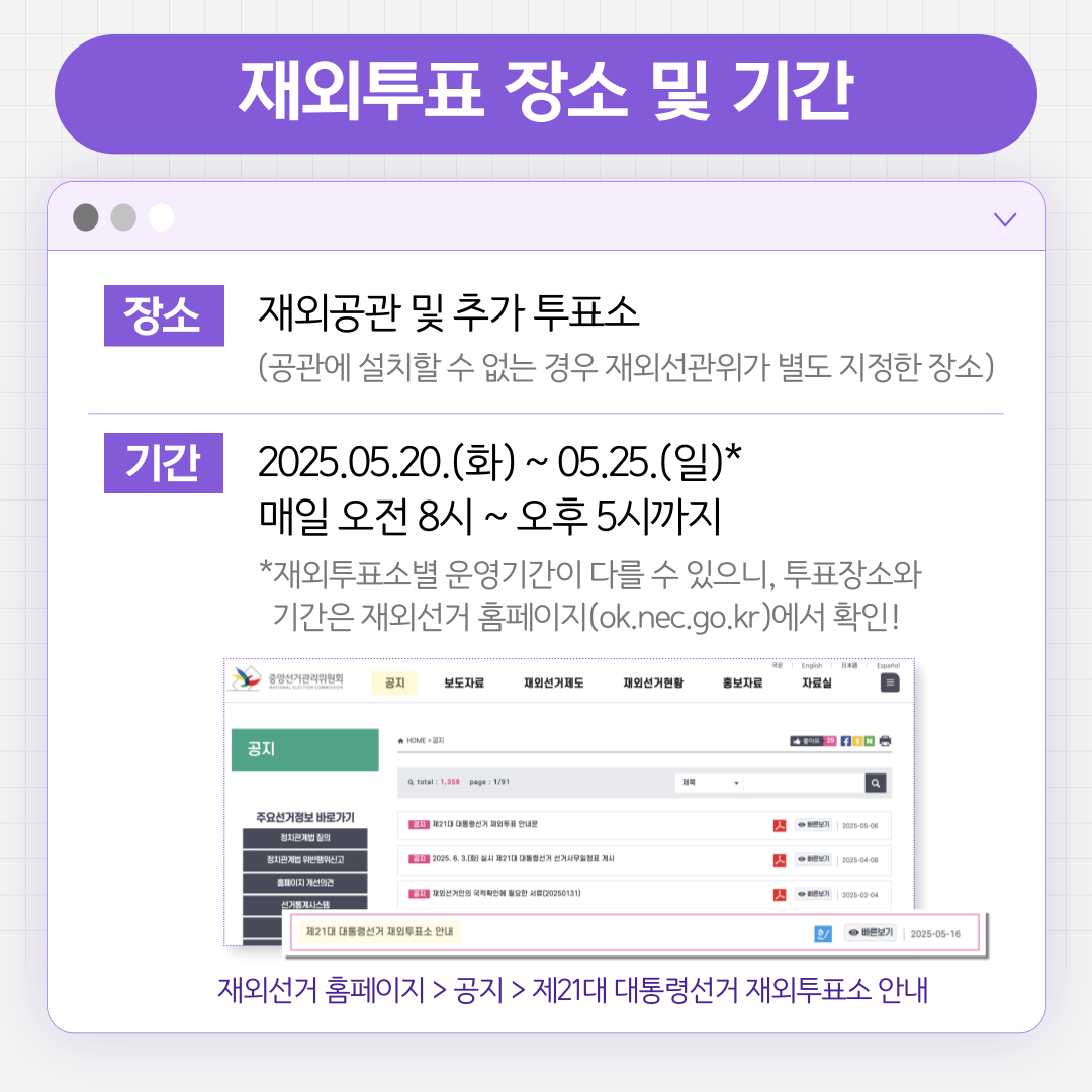 이번 대선 재외투표는 전 세계 118개국 223개 투표소에서 오는 25일까지 엿새간 진행된다.