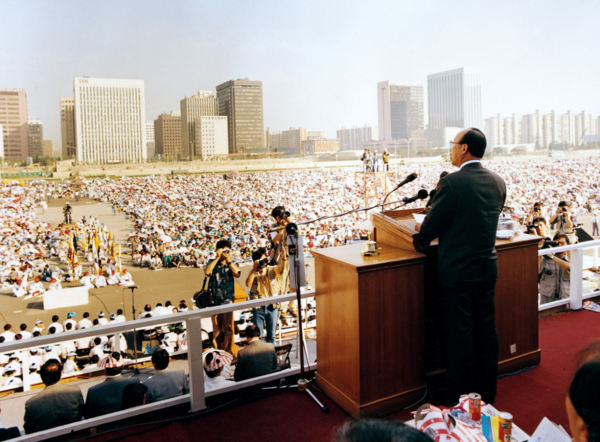 1994년 서울 여의도광장에서 열린 '나라와 민족을 위한 기도회'에서 여의도순복음교회 당회장인 조용기 목사가 설교하고 있다. 여의도순복음교회