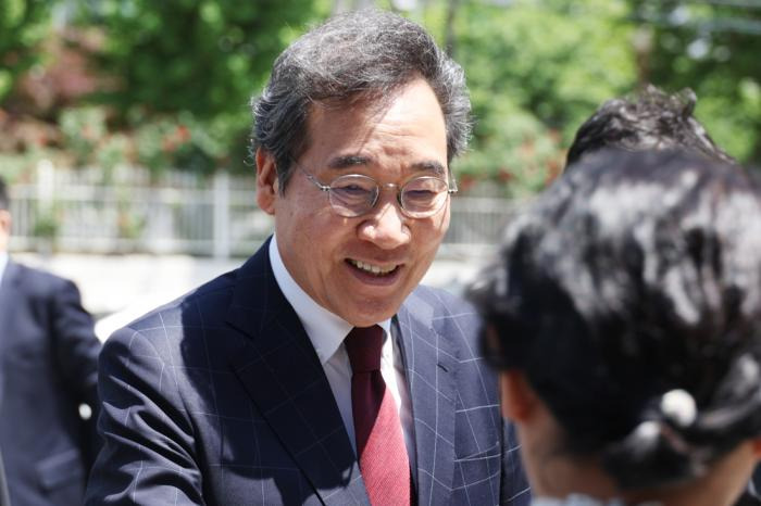 이낙연 새미래민주당 상임고문이 2일 대구 북구 침산동 한 식당 앞에서 지지자들과 만나 인사하고 있다. 연합