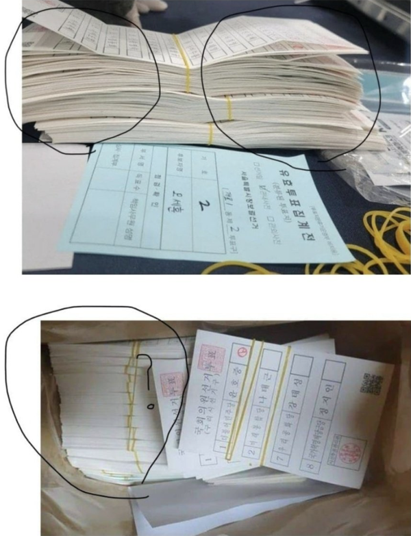 보다시피 이 사진을 편집해 올린 사용자는 위의 투표지에는 접힌 자국이 보이고 아래의 투표지에는 접힌 자국이 안 보인다는 것을 강조하려 친절하게도 각각 동그라미 표시까지 해놓았다.