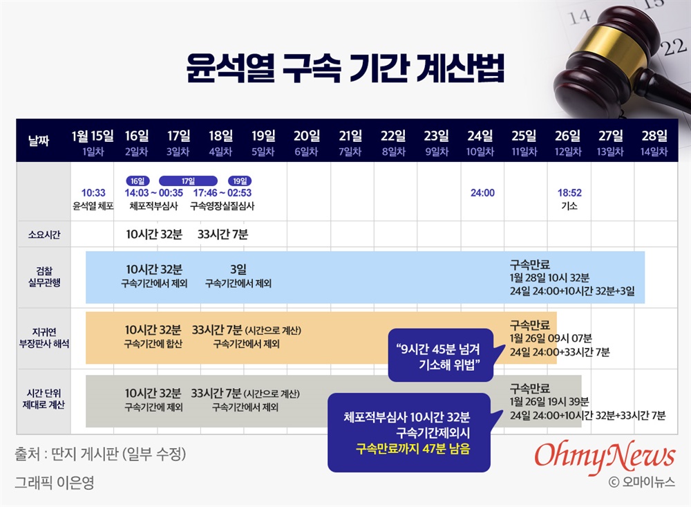 윤석열 대통령 구속기간 만료시한과 관련하여 다양한 계산법을 정리하면 이렇다.