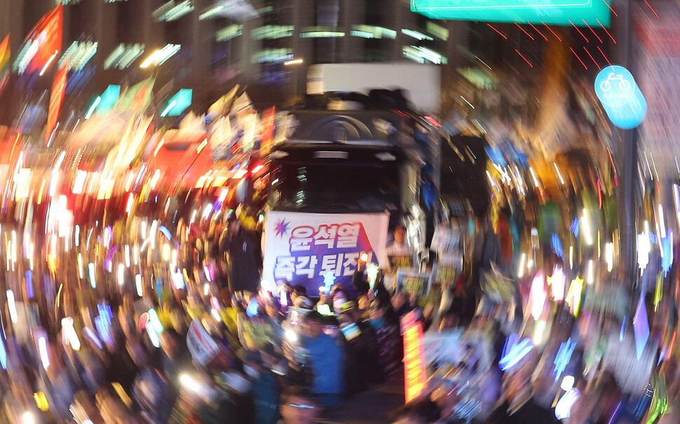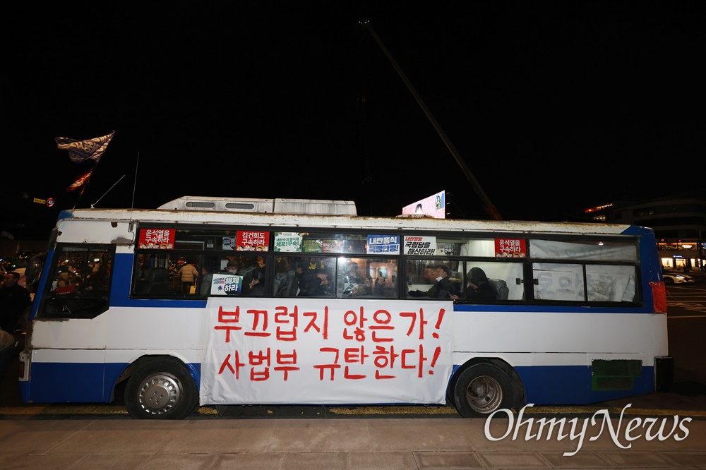 ▲ ‘윤석열 즉각 퇴진, 사회대개혁 14차 범시민대행진’이 8일 오후 서울 종로구 광화문앞에서 윤석열퇴진비상행동 주최로 열렸다. 시민대행진에 참여한 버스에 윤석열 대통령 구속을 취소한 사법부를 규탄하는 내용의 ‘이것이 법치인가? 정의는 무너졌다!’ ‘부끄럽지 않은가! 사법부 규탄한다!’ 구호가 내걸려 있다. ⓒ 권우성