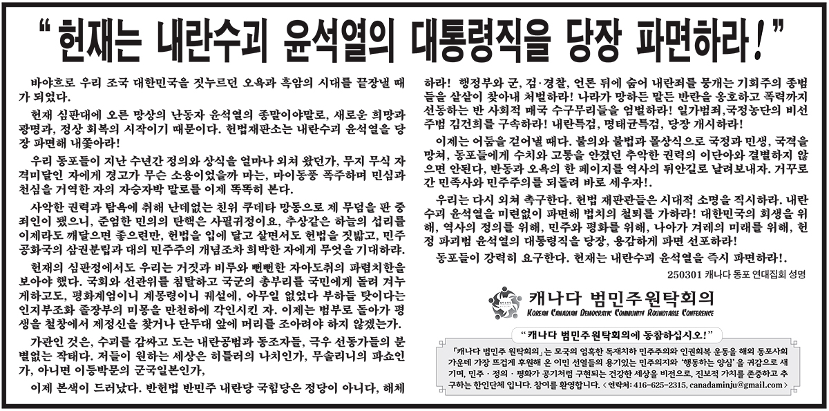 캐나다 범민주원탁회의 내란수괴 윤석열 방면규탄 성명