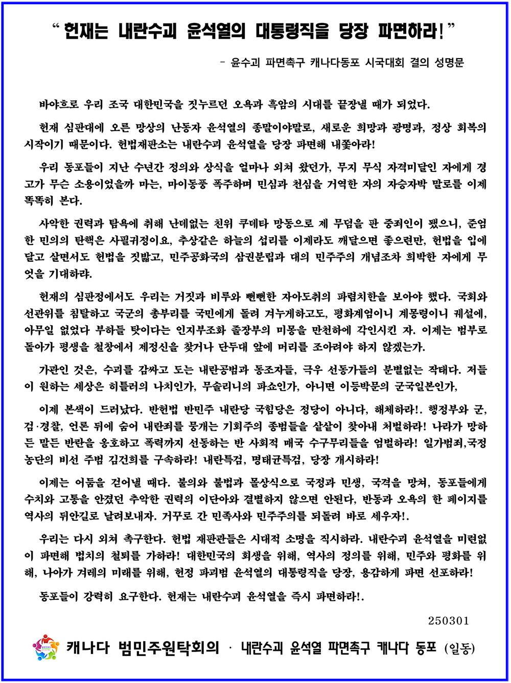 | 캐나다 동포들 “내란수괴 윤석열 헌재 즉시 파면” 촉구 연대집회 (0) | 2025.03.04 |
