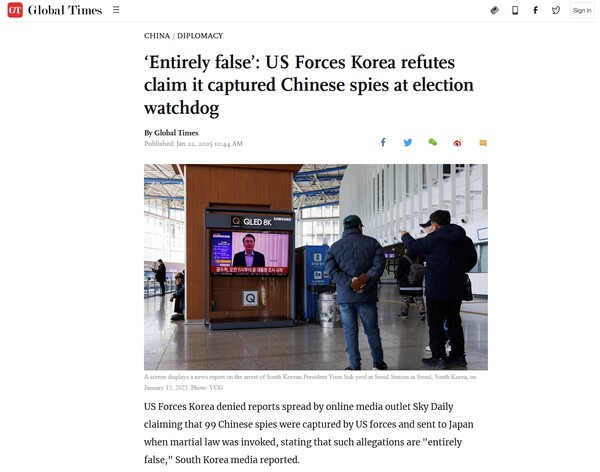 지난달 22일 환구시보의 영문판 <글로벌타임즈>에서도 "주한미군 '완전히 거짓…선관위에서 중국 간첩을 체포했다는 주장 반박"이라는 제목으로 <스카이데일리> 보도가 '전적으로 거짓'이라고 입장을 낸 주한미군과 선관위, 대통령을 수사하고 있는 한국의 국가수사본부의 입장을 <한겨레>를 인용해 보도했다.