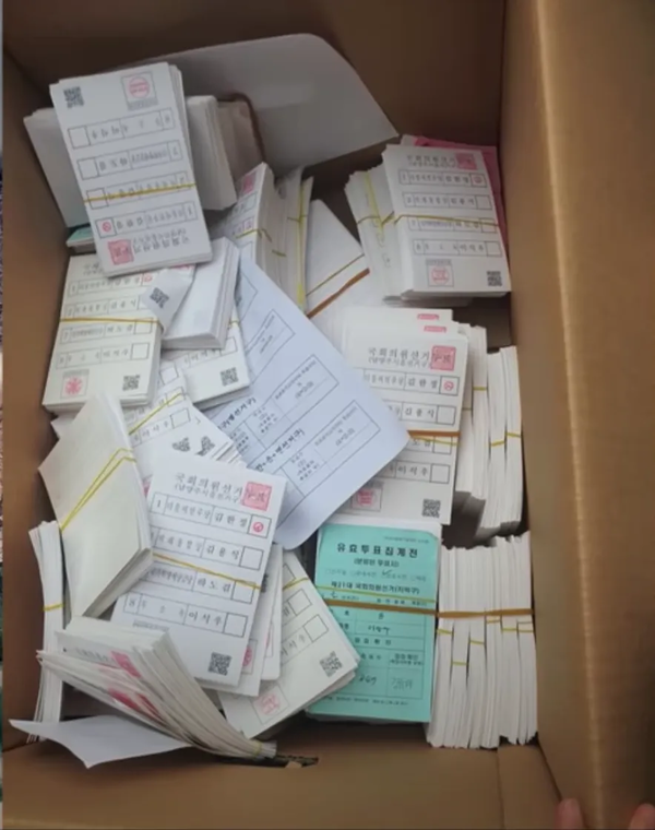 나아가서, 그는 이 사진을 올리면서 “이런 빳빳한 용지들은 모두 하나같이 1번에 기표가 되어 있다”고 주장하기도 했다. 그런데 이 주장은 어느 정도 사실이면서 동시에 사실이 아니다. 왜냐하면 분류가 끝나 후보자별로 묶인 묶음이기 때문이다.