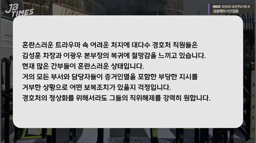 경호처 내 강경파인 김 차장과 이광우 경호본부장은 최근 경찰에 출석한 직후 체포됐다. 이들은 조사 과정에서 특수공무집행방해 혐의를 부인했다고 전했다.