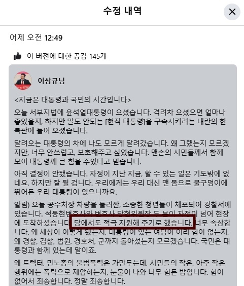 그러면서 “필요한 건 마녀사냥이 아니라 사태를 정확히 파악해 진상을 규명하고 차분하고 성숙한 자세로 국가적 혼란을 극복하는 것”이라며 “우리 당도 폭력을 선동하거나 비호한다는 소리를 듣지 않도록 각별히 말과 행동을 주의해 주길 바란다”고 덧붙였다.