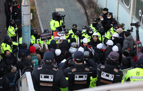 고위공직자범죄수사처와 경찰이 윤석열 대통령 체표영장 집행에 나선 3일 서울 한남동 대통령 관저 입구에서 대통령 지지자들이 경찰과 실랑이를 하고 있다. 2024.1.3. 연합