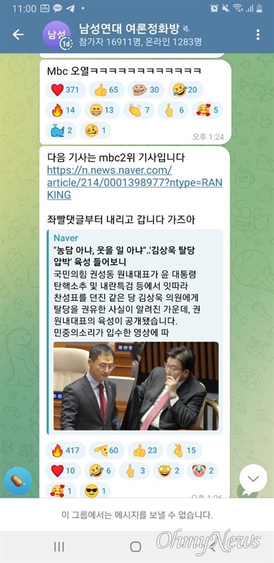 앞서 <오마이뉴스>는 지난 9~10일 신남성연대 측이 텔레그램과 디스코드 등에 단체 채팅방을 운영하면서 윤석열 대통령을 지지하거나 야당을 비판하는 네이버 댓글을 집중 추천해 노출도를 높이는 형태의 댓글 작업을 조직적으로 실시하고 있다고 보도했다. 현재까지 이런 댓글 작업이 이뤄진 네이버 인링크 기사는 30건 이상으로 확인되고 있다.