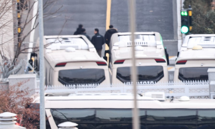 고위공직자범죄수사처가 윤석열 대통령에 대한 체포영장을 다시 발부받은 다음 날인 8일 오전 서울 용산구 한남동 대통령 관저로 향하는 입구가 버스로 막혀있다. 연합