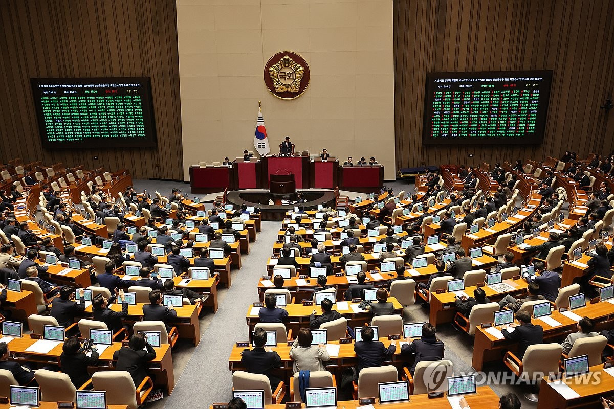 내란 특검법 본회의 통과= 12월 12일 오후 국회 본회의에서 '윤석열 정부의 위헌적 비상계엄 선포를 통한 내란 행위의 진상규명을 위한 특별검사 임명 등에 관한 법률안'이 통과되고 있다. [연합]