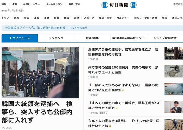 앞서 미국과 영국, 일본을 포함한 세계 주요 통신과 방송들은 이날 아침부터 대한민국 헌정사상 최초로 ‘내란 우두머리’ 혐의를 받는 현직 대통령에 대한 체포영장을 집행하기 위해 서울 한남동 대통령관저로 진입한 공수처 검사와 수사관, 경찰 지원인력이 대통령 경호처 직원과 대치 중인 현장을 실시간으로 전해 긴박한 한국의 정치 상황에 대한 뜨거운 관심을 드러냈다. < 민들레 이유 기자 >