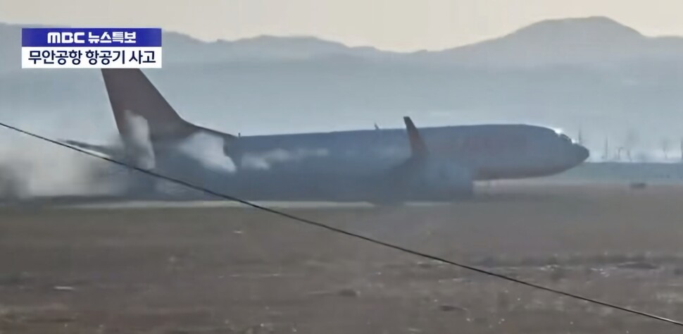 29일 오전 전남 무안국제공항에서 착륙 중이던 항공기가 활주로를 이탈해 울타리 외벽을 충돌했다. 사진은 무안공항 인근에서 촬영된 영상으로 엔진 쪽에서 연기가 발생한 모습. ‘문화방송’ 화면 갈무리