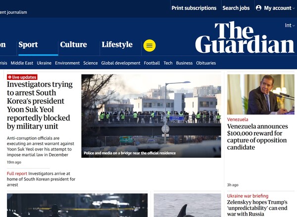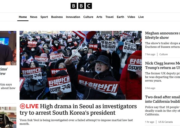 앞서 미국과 영국, 일본을 포함한 세계 주요 통신과 방송들은 이날 아침부터 대한민국 헌정사상 최초로 ‘내란 우두머리’ 혐의를 받는 현직 대통령에 대한 체포영장을 집행하기 위해 서울 한남동 대통령관저로 진입한 공수처 검사와 수사관, 경찰 지원인력이 대통령 경호처 직원과 대치 중인 현장을 실시간으로 전해 긴박한 한국의 정치 상황에 대한 뜨거운 관심을 드러냈다. < 민들레 이유 기자 >