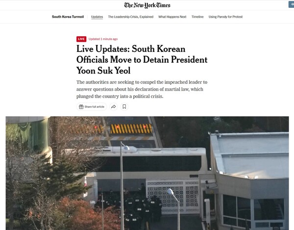미국 CNN은 "한국 수사관들이 극적인 대치 끝에 대통령 구인 시도를 중단했다'란 기사를 내보냈다. CNN은 "한국 수사관들이 장시간 대치 이후 궁지에 몰린 대통령 윤석열에 대한 체포영장 집행 시도를 중단했다"며 이날 오전 약 80명의 경찰과 공수처 수사관들이 대통령관저 구내로 진입했지만, "반항하는, 궁지에 몰린 윤석열"과 대치했다고 전했다. CNN는 "비겁하게 숨어있는 관저에서 걸어 나와 체포영장 집행에 응하라"는 더불어민주당의 성명을 소개했다.