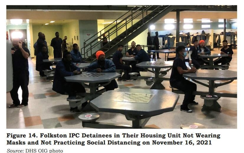 미국 이민 당국에 체포된 한국인 300여명 중 대부분이 구금된 미국 조지아주 포크스턴의 이민세관단속국(ICE) 시설. 당시 코로나19에도 시설 내부에서 대부분이 마스크를 착용하지 않고 있는 모습. 사진은 2021년 11월16일 촬영된 내부 모습이다. 미 국토안보부
