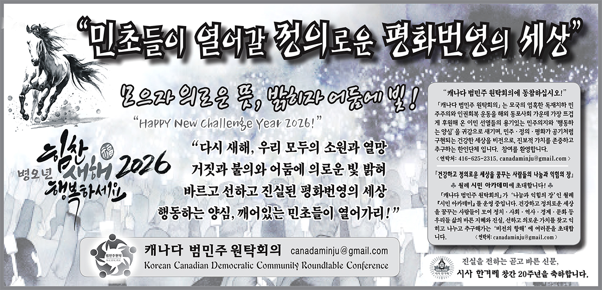 | 캐나다 범민주원탁회의,“내란종식과 대개혁으로 평화의 원년 이루길”성명 (0) | 2026.01.10 |