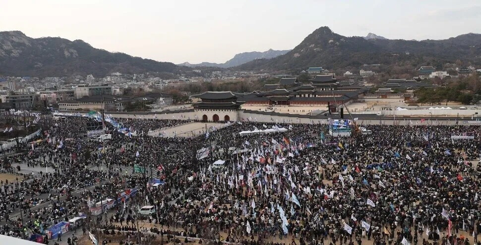 ‘윤석열 즉각퇴진·사회대개혁 비상행동’(비상행동)이 지난 3월15일 오후 서울 종로구 광화문 동십자각 일대에서 ‘100만 시민 총집중의 날’ 집회를 열고 있다. 강창광 선임기자