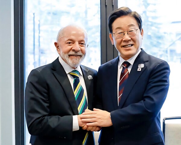 이재명 대통령과 루이스 이나시우 룰라 다시우바 브라질 대통령이 17일(현지시간) 캐나다 앨버타주 캐내내스키스 주요 7개국(G7) 정상회의장에서 한·브라질 정상회담 전 악수하고 있다. 2025.6.18 [공동취재] 연합