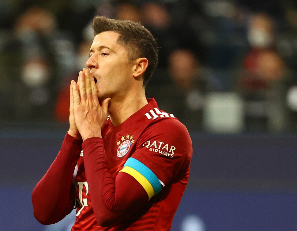 바이에른 뮌헨 로베르토 레반도프스키가 지난 26일(현지시각) 독일 프랑크푸르트 코메르츠방크에서 열린 2021∼2022 분데스리가 24라운드 프랑크푸르트전에서 왼팔에 우크라이나와 연대를 상징하는 밴드를 착용하고 있다. 프랑크푸르트/로이터 연합뉴스