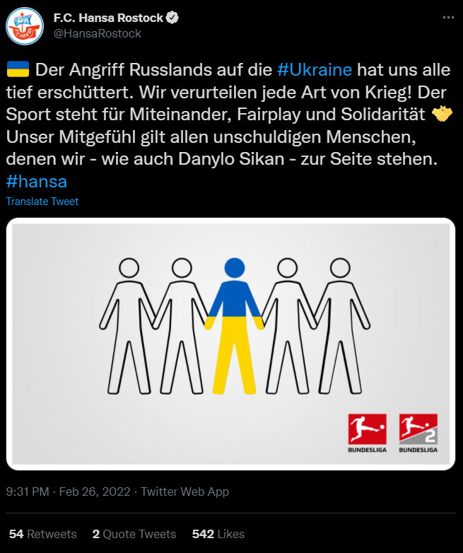 독일 상위 2개 리그를 통틀어 유일한 우크라이나 출신인 다닐로 시칸(21)이 속한 FC한자 로스토크도 적극적인 반전 움직임을 보였다. 로스토크는 경기 직전 공식 채널을 통해 우크라이나에 대한 지지 트윗을 게재했는데 그 내용은 “러시아의 우크라이나 침공은 우리 모두를 뒤흔들었다. 우리는 모든 종류의 전쟁을 규탄한다. 스포츠는 통합, 페어플레이, 연대를 상징한다. 우리는 무고한-다닐로 시칸을 비롯한-사람들을 지지한다”였다.