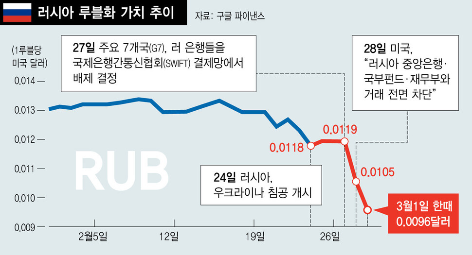 러시아가 자기 돈인 4000억달러의 외환보유고에 손을 못 대면, 우크라이나 침공 개시 이후 30% 폭락한 자국 통화 루블화의 추가 하락을 막기 어려워진다. 달러로 시장의 루블화를 매입해서 루블화 가치를 유지해야 하는데 그게 힘들어지기 때문이다. 전쟁 이전인 2월 중순 1루블은 미화 1.3센트 수준이었으나, 지난달 24일 개전 직후 떨어지기 시작해 27일 서방의 러시아 은행들에 대한 국제은행간결제망(SWIFT) 퇴출 결정을 거치면서 추락을 거듭했다. 구글 파이낸스 자료를 보면, 미국의 러시아 중앙은행과의 거래 중단 발표 이후 1일 한때 1루블은 0.96센트로, 1센트 밑으로 떨어지기도 했다.