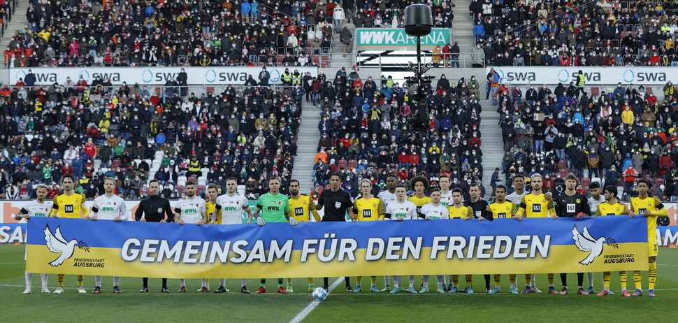 지난 27일 독일 아우크스부르크에서 열린 2021∼2022 분데스리가 24라운드 아우크스부르크와 보루시아 도르트문트 경기 시작 전 선수들이 “평화를 위해 함께 한다”는 내용을 담은 우크라이나 지지 펼침막을 들고 서 있다. 아우크스부르크/EPA 연합뉴스