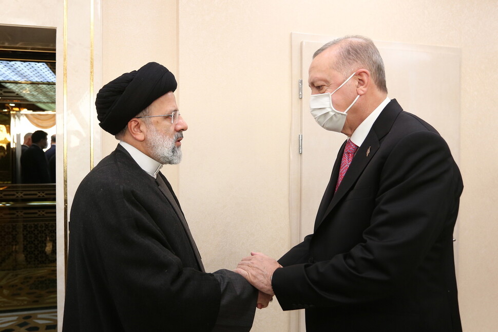에브라힘 라이시 이란 대통령이 28일 투르크메니스탄 아시가바트에서 열린 제15회 경제협력기구 정상회의에서 레제프 타이이프 에르도안 터키 대통령과 만나 손을 맞잡고 있다. 대미 강경파인 라이시 대통령은 이란 핵협정 복귀를 위해 미국 등에 매우 까다로운 요구를 쏟아내고 있다. 아시가바트/EPA 연합뉴스