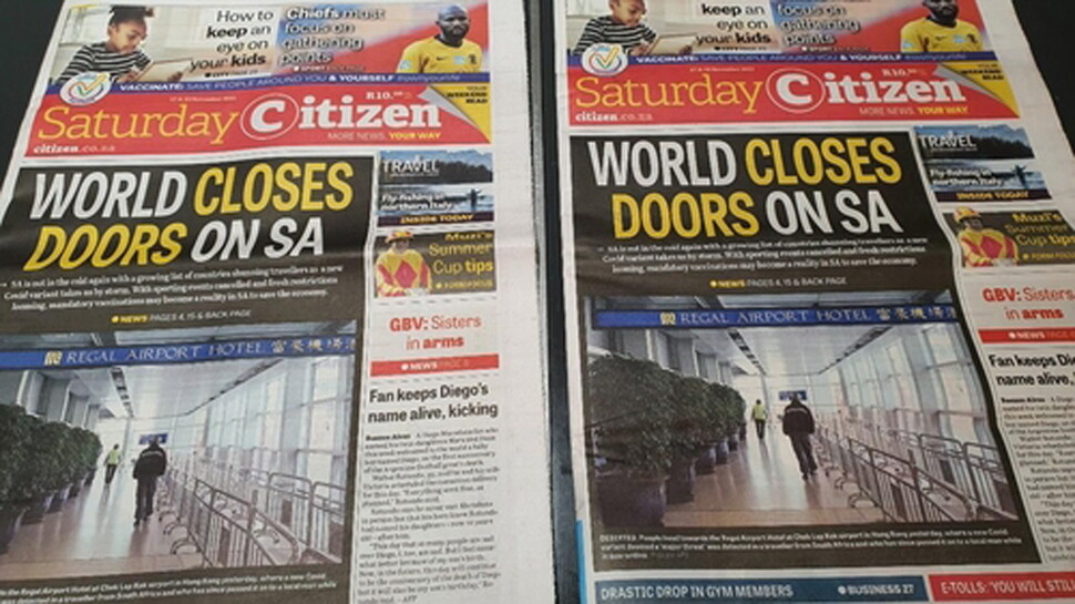 세계 많은 나라가 새 코로나19 변이 ''오미크론''이 확산 중인 남아프리카공화국에 대해 항공편 중단 등 사실상 봉쇄를 가하는 가운데 27일 남아공 현지 신문 토요판에 실린 기사 모습. ''세계가 남아공에 문을 닫고 있다''라는 제목과 함께 텅 빈 홍콩 공항 사진을 보여주고 있다. 프리토리아/연합뉴스