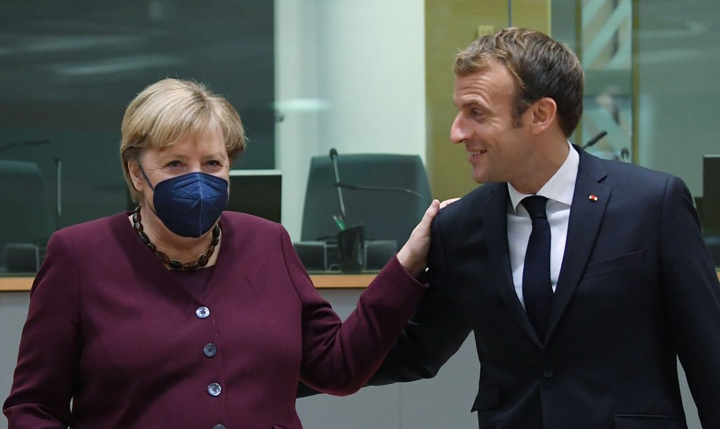 EU 정상회의서 정겹게 담소하는 메르켈·마크롱=유럽연합(EU) 정상회의 둘째 날인 22일 벨기에 브뤼셀의 유럽의회에서 앙겔라 메르켈(왼쪽) 독일 총리와 에마뉘엘 마크롱(오른쪽) 프랑스 대통령이 다정히 어깨 위에 손을 얹고 담소하고 있다. EU 정상들은 이틀 일정으로 신종 코로나바이러스 감염증(코로나19) 사태와 에너지 가격 급등, 이민 문제 등을 논의한 뒤 이날 회의를 마쳤다.
