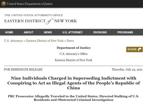 * 미 뉴욕시 동부지검은 22일 이른바 ’여우사냥 작전’이란 이름으로 중국 당국이 벌인 미국 거주자 강제 송환 시도와 관련해 9명이 기소됐다고 밝혔다. 누리집 갈무리