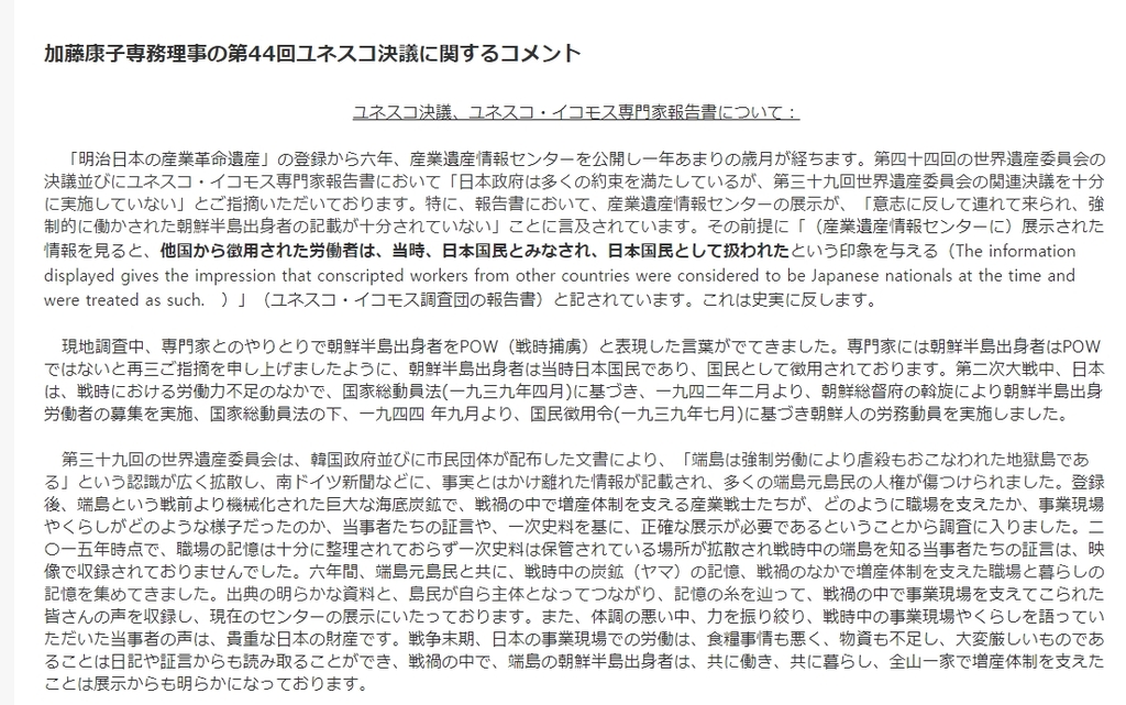 * 메이지(明治)일본의 산업혁명유산을 전시하는 시설인 '산업유산정보센터' 운영 법인인 '산업유산국민회의'가 22일 세계유산위원회가 조선인 징용 실태 전시가 불충분하다며 시정을 촉구하는 내용의 결정문을 채택한 뒤 홈페이지에 올린 성명.