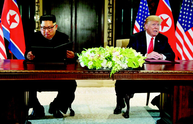 김정은 북한 국무위원장과 도널드 트럼프 미국 대통령이 2018년 6월12일 싱가포르에서 정상회담을 마무리한 뒤 공동성명 서명식을 하고 있다. 싱가포르/연합뉴스