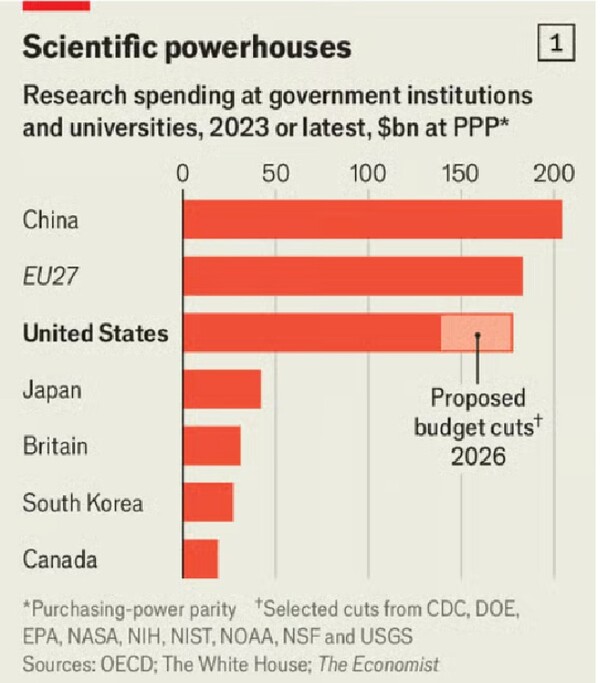 이런 예산 삭감은 의회의 승인을 받아야 하지만, 상하원을 공화당이 지배하고 있는 의회에서 이 예산안이 통과될 경우, 8만 명 이상의 연구자들이 일자리를 잃을 것으로 추산된다. 그렇게 될 경우 미국의 학술과학연구 지원금은 중국이나 유럽연합(EU)보다 상당히 부족한 상태가 될 것이다.(<이코노미스트> 5월 21일)