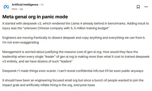 하지만 미국 빅테크 직원들이 다수 가입한 직장인 익명 커뮤니티 ‘블라인드’에는 딥시크가 알원을 공개한 직후 “메타의 생성형 인공지능 조직이 패닉 상태”라는 제목의 글이 올라오기도 했다. 이 글을 쓴 한 메타 직원은 딥시크의 개발비보다 더 많은 연봉을 받는 조직 리더들을 언급하며 “경영진은 생성형 인공지능 조직의 막대한 비용에 대한 해명을 걱정하고 있다”고 주장했다.