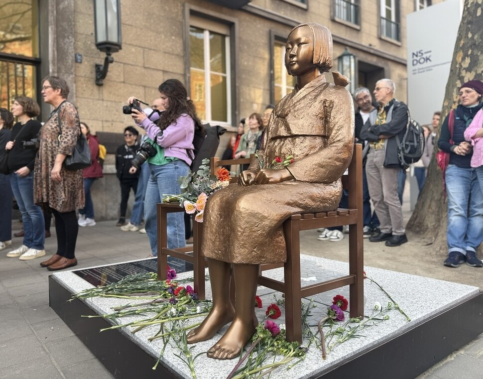 8일 화창한 낮 쾰른의 나치기록박물관 앞에서 열린 소녀상 제막식엔 250여명(경찰 추산)이 모여 길목을 꽉 채웠다. 여성의 날과 소녀상 설치를 축하하기 위해 꽃을 들고 온 사람들은 소녀상을 감싼 보라색 장막이 걷히자 환호했고, 동상 주위를 화려한 꽃으로 장식했다. 2차 세계대전 당시 게슈타포(나치 비밀경찰) 본부 건물로 악명을 떨쳤던 박물관 건물을 등진 소녀상은 이곳을 걷는 사람들을 마주하는 방향에 놓였다. 붉은 장미를 갖고 소녀상을 찾은 수잔느(59)는 “신문에서 제막식 소식을 보고 왔다”며 소녀상 이야기는 “모든 여성들과 연결돼 있다. 지금이라도 (과거의) 역사를 인정하고, 희생된 사람들에게 존중을 표하는 일은 늦지 않았다”고 말했다.