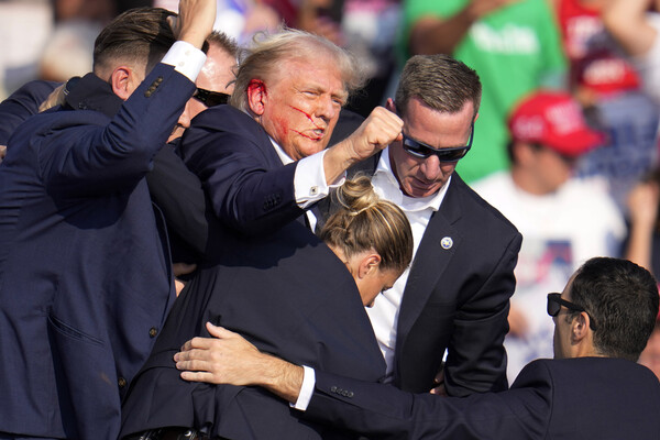 미국 공화당의 대선 후보인 도널드 트럼프 전 대통령이 13일 펜실베이니아주 버틀러에서 유세 도중에 총격 사건이 발생하자 경호 요원들의 부축을 받으며 무대에서 내려가고 있다. 2024. 07.13 AP 연합