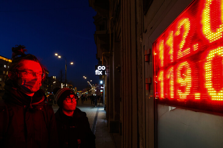 2일(현지시각) 러시아 수도 모스크바에서 시민들이 전광판에 표시된 환율을 보고 있다. 러시아의 우크라이나 침공 뒤 세계 각국이 가한 경제제재 때문에 러시아 루블화 가치는 3일 또다시 사상 최저치로 떨어졌다. 모스크바/타스 연합뉴스