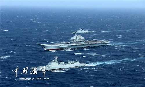 2017년 1월 중국 최초의 항공모함 랴오닝호가 남중국해에서 훈련하고 있다. 출처: 글로벌 타임스