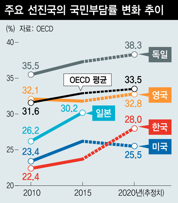 6일 오이시디가 펴낸 ‘국민부담률 통계 2021’을 보면, 한국의 국민부담률은 2020년 28.0%로 전년(27.3%)보다 0.7%포인트 올랐다. 같은 기간 회원국 평균이 0.1%포인트 오른 것에 견주면 상대적으로 높은 증가 폭이지만 여전히 평균인 33.5%과는 5.5%포인트 차이를 보였다. 38개국 가운데 덴마크(46.5%), 프랑스(45.4%), 이탈리아(42.9%) 등 선진국이 선두권을 차지했고, 30%에 못 미치는 나라는 한국을 포함해 미국(25.5%), 터키(23.9%), 코스타리카(22.9%), 아일랜드(20.2%), 칠레(19.3%), 콜롬비아(18.7%), 멕시코(17.9%) 등 10개국이었다.