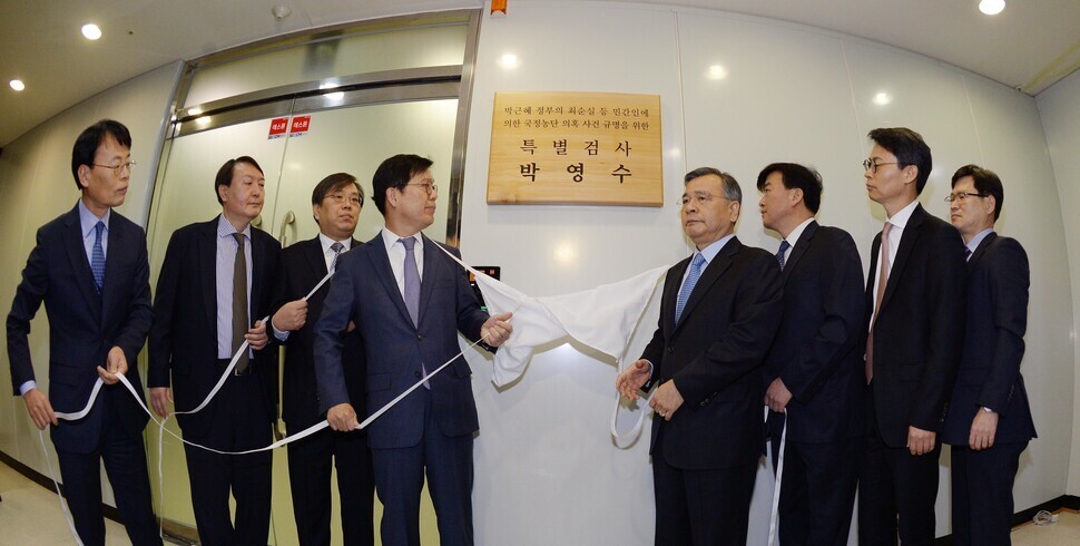 박영수(오른쪽에서 네번째) 특별검사팀이 2016년 12월21일 서울 대치동 특검 사무실 앞에서 현판식을 열고 있다. 왼쪽에서 두번째가 수사팀장이었던 윤석열 국민의힘 대선 후보.