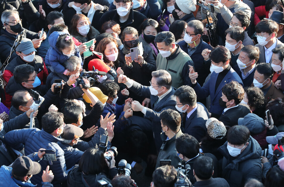 이 후보는 전북 ‘매타버스’(매주 타는 민생버스) 사흘째인 이날 오전 정읍 샘고을시장을 찾아 “국민이 먹고사는 문제가 가장 중요하다. 민생을 챙기는 것이 가장 중요하다”며 “과거를 향해 복수하는 일은 개인적인 일”이라고 했다. 이어 이 후보는 “우리가 군사정권을 증오했는데, 지금 다시 온갖 전직 검사들로 만들어진 세력이 내년 선거에서 이겨서 검찰국가 만들겠다고 도전하고 있다. 이것을 용인하겠는가”라고도 외쳤다. 윤석열 후보가 정권교체 여론을 등에 업고 검찰 조직 등을 위한 사적인 복수 정치를 하고 있다고 비판한 것이다.