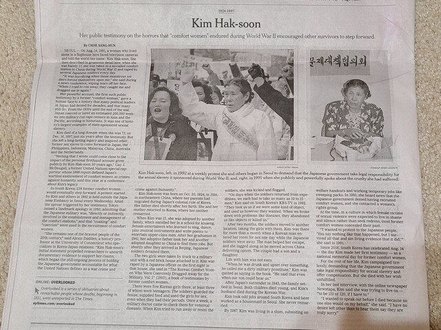 서울 주재 특파원인 최상훈 기자가 작성한 이 기사는 김 할머니가 1991년 8월14일 기자회견을 통해 위안부 피해자로서 자신의 피해 사실을 처음으로 증언하던 장면부터 시작한다. 김 할머니의 강력한 증언이 일본의 많은 정치인들이 지금까지도 부정하고 있는 역사를 현실로 바라보게 해줬다고 짚었다. 김 할머니의 용기 있는 증언 이후 북한, 필리핀, 인도네시아, 말레이시아, 네덜란드 등 다른 나라의 위안부 피해자들도 역사의 전면에 나서 자신의 피해를 호소할 수 있게 되었다. 오랫동안 외면 받아온 ‘전시하 여성의 인권’이라는 문제가 인류가 함께 고민해야 하는 중요한 인권 현안으로 부상하게 된 것이다.