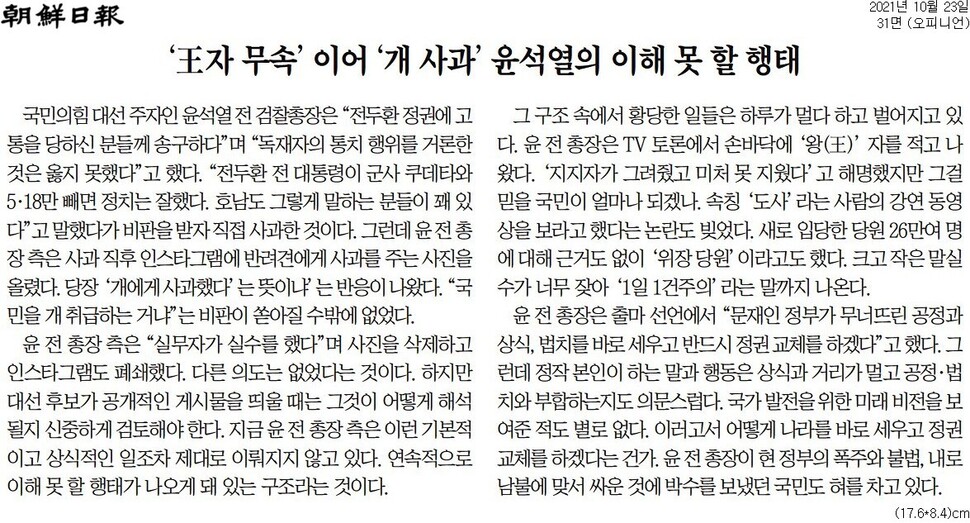 ☞ ‘왕(王)자 무속’ 이어 ‘개 사과’ 윤석열의 이해 못 할 행태(10월 23일, 조선일보)